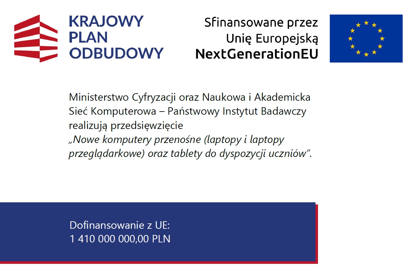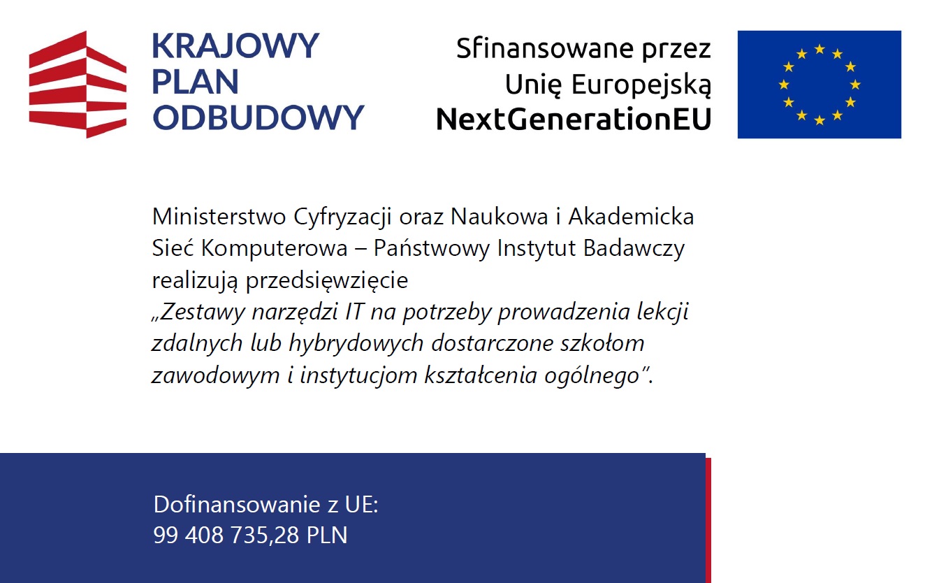 - „Wdrażanie inwestycji C2.2.1 Wyposażenie szkół/instytucji w odpowiednie urządzenia i infrastrukturę ICT w celu poprawy ogólnej wydajności systemów edukacji, wskaźnik C12L Zestawy narzędzi informatycznych na potrzeby prowadzenia lekcji zdalnych lub hybrydowych dostarczone szkołom zawodowym i instytucjom kształcenia ogólnego”.